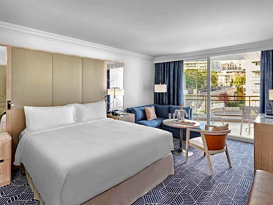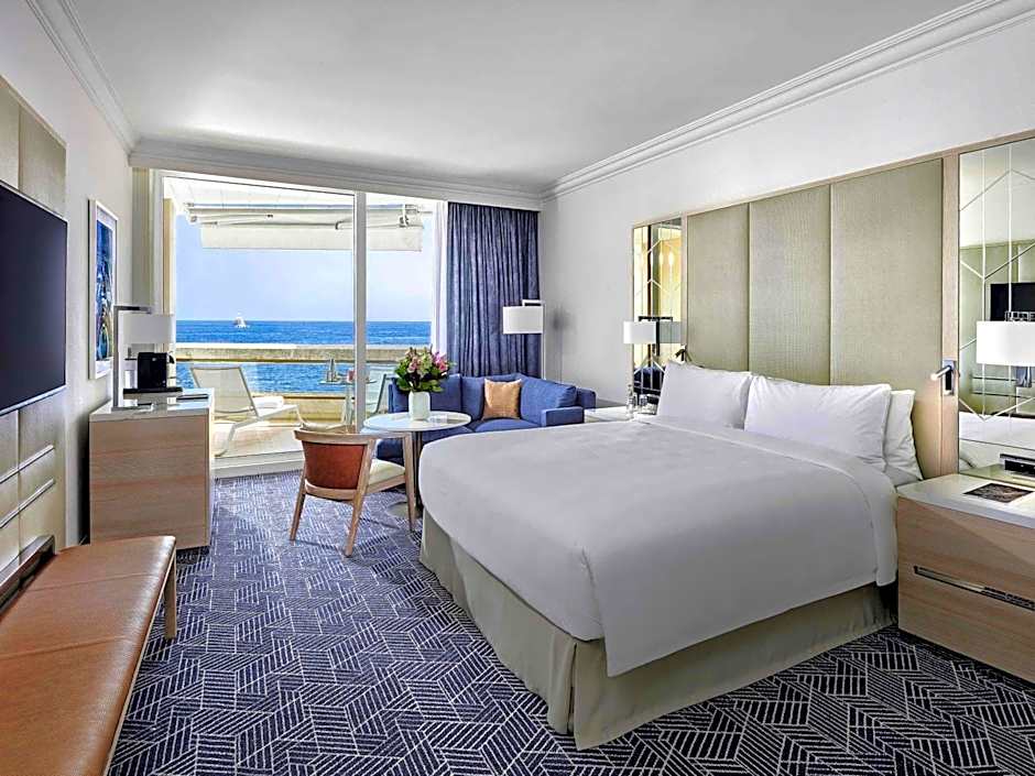 Viewing the Mediterranean Sea and located on the property's highest floors, this nonsmoking double room features a large double bed and beige colors with some blue and orange touches. It has a large window, a terrace with sunbeds, chairs and a table, as well as a marble bathroom.